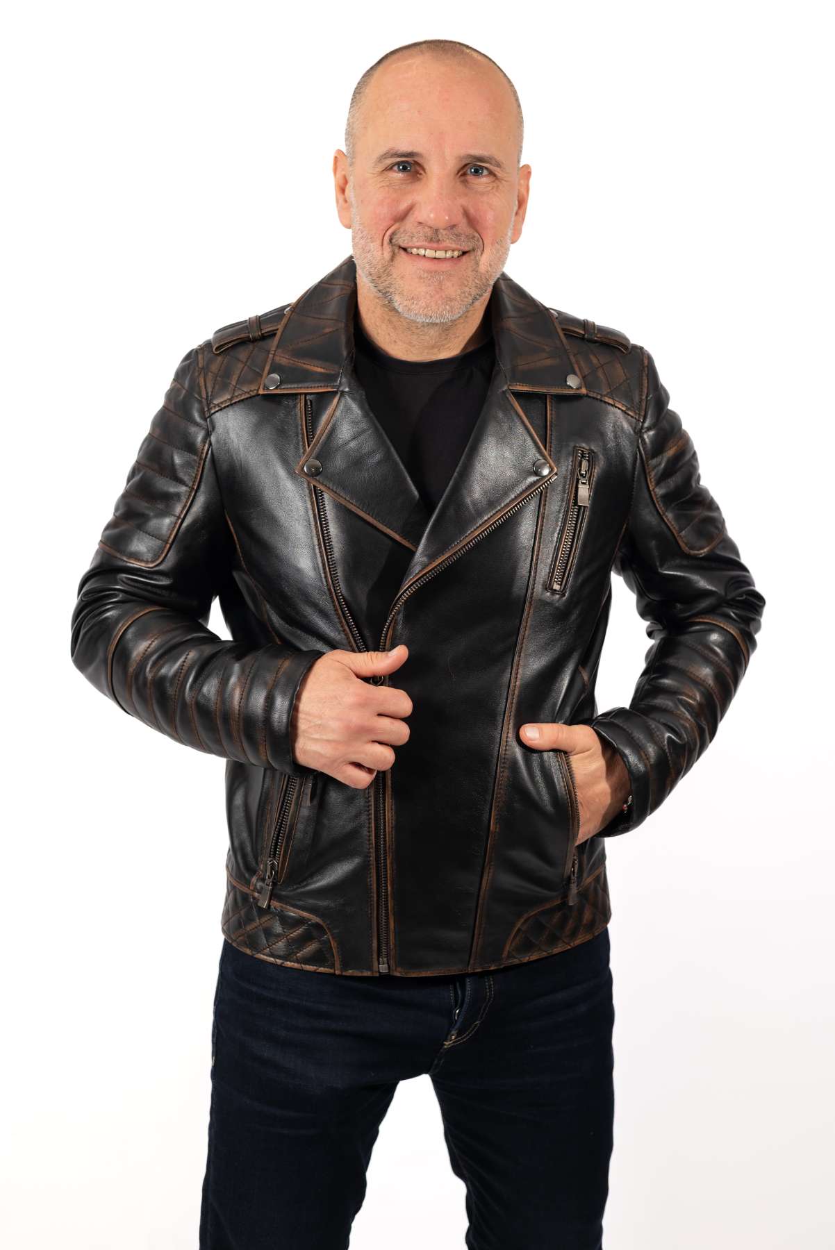 Exclusive men's leather jacket from the limited NEW LEATHER collection. The spectacular decorative and smoky seams of the leather jacket give it an exceptional modern and individual style.Leather jacket Ogi is made of high-quality lambskin. Processing that makes the leather soft and comfortable, at the same time very strong and durable. The silhouette is sporty-elegant, casuarina type /fastening with diagonal zipper/, slightly beveled and conveys a modern look. The leather jacket Ogi has three external and two internal pockets.
