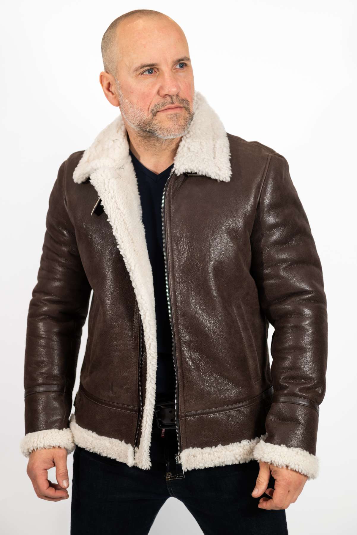 Very light and warm men's coat in a modern color and silhouette. Modern and light men's lambskin coat in brown with white fur. The model is a pilot type. Comfortable length when driving. The Alen coat is very warm and light, made of high-quality lambskin, which is resistant to winter weather conditions.