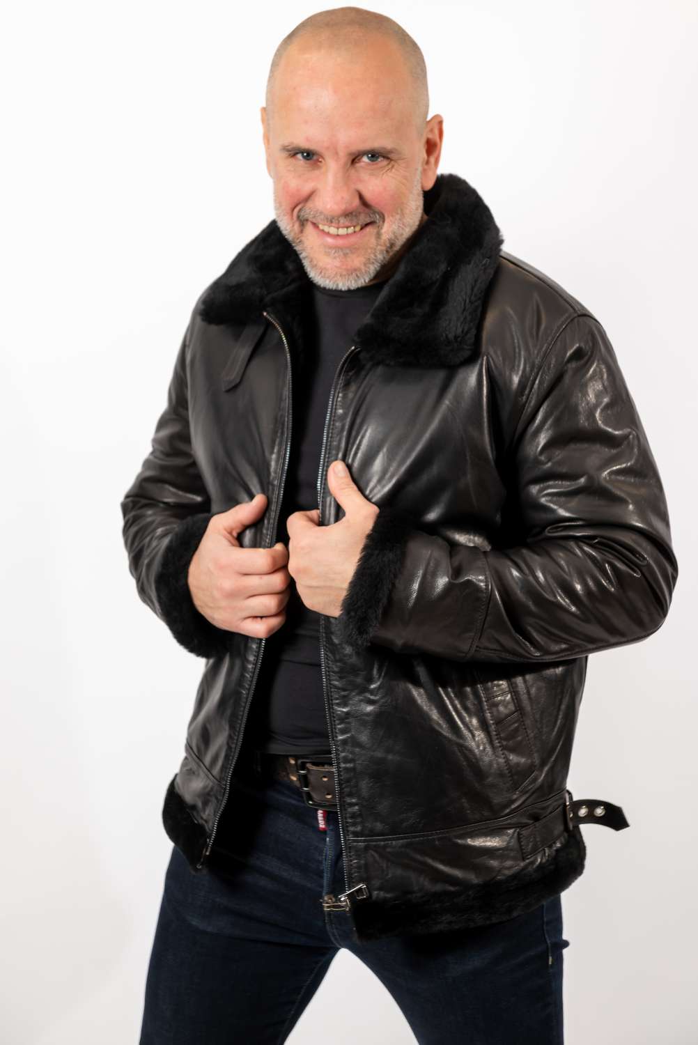 Modern and lightweight men's lambskin coat in black color made of double lambskin. The model is a pilot type. Comfortable length when driving. The coat Biser is very warm and lightweight, made of high-quality lambskin and tulle, which is resistant to winter weather conditions.