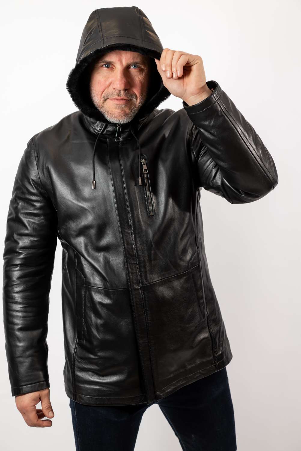 Warm and light men's coat made of natural lambskin in black. Men's coat Boril has a clean and elongated silhouette, convenient three external and two internal pockets. The comfortable and warm hood will keep you warm even on the coldest winter days.Men's coat Boril is made of double leather - black lambskin and black warm lambskin.