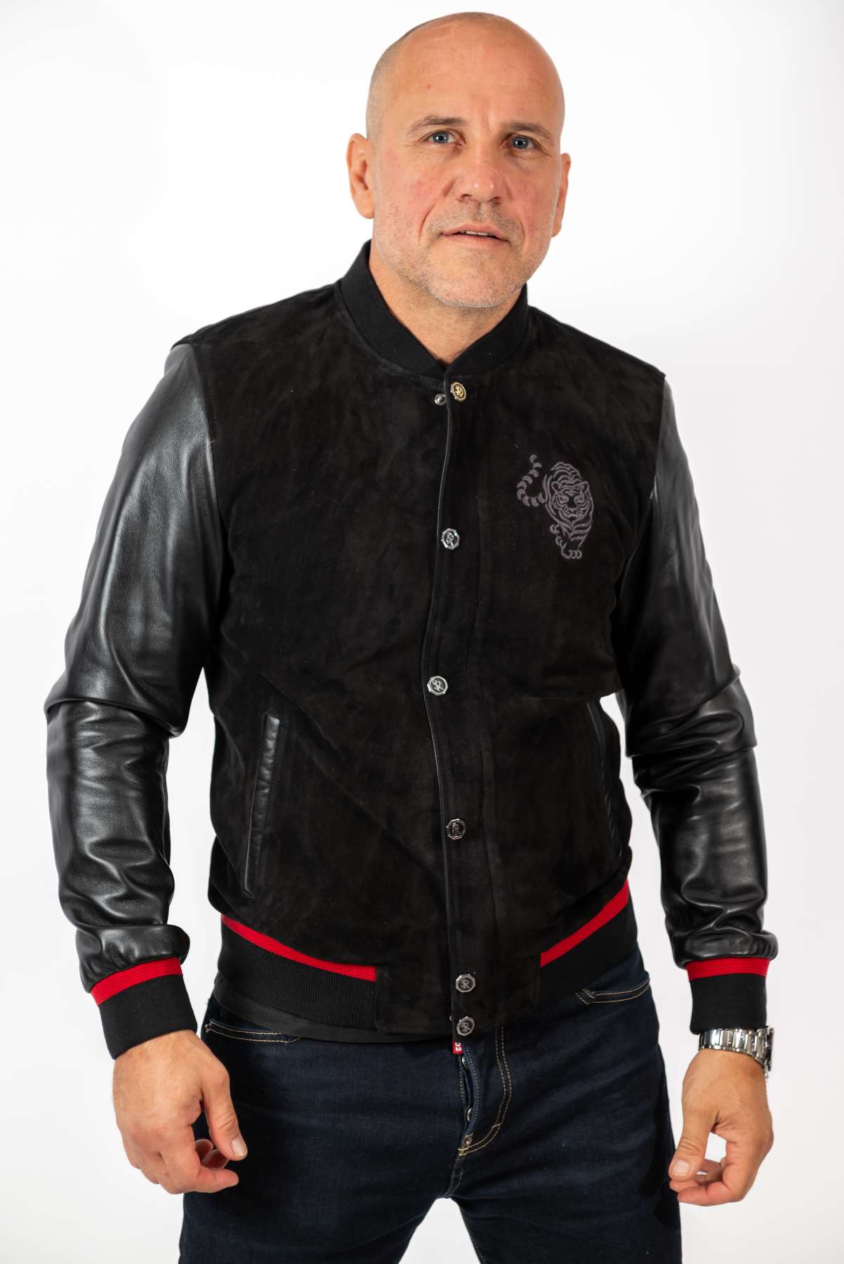 Unique men's bomber jacket, made of high-quality natural suede and lambskin lining on the sleeves. There is an embroidered tiger on the back. There are two comfortable outer pockets and two inner ones. Comfortable light lining made of high-quality breathable fabric. If you are an individualist and want a quality men's leather jacket, this is your jacket. An ideal leather jacket for the spring-autumn season.