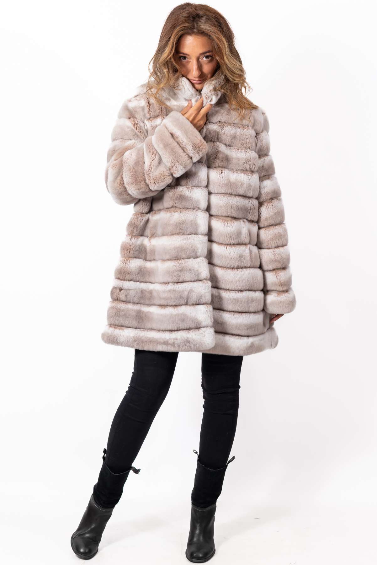 Luxurious women's coat Valeria is made of high-quality natural chinchilla fur. Modern and stylish cut. Unique beige melange color. The chinchilla coat allows it to be worn in two different lengths. The last three rows of the coat and the sleeves are removed via zippers.It has two convenient outer pockets. A light, warm and comfortable coat for every occasion in your everyday life.