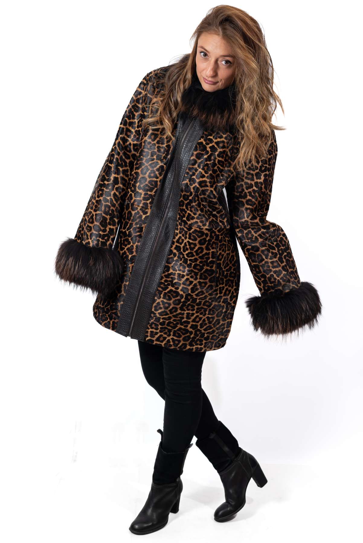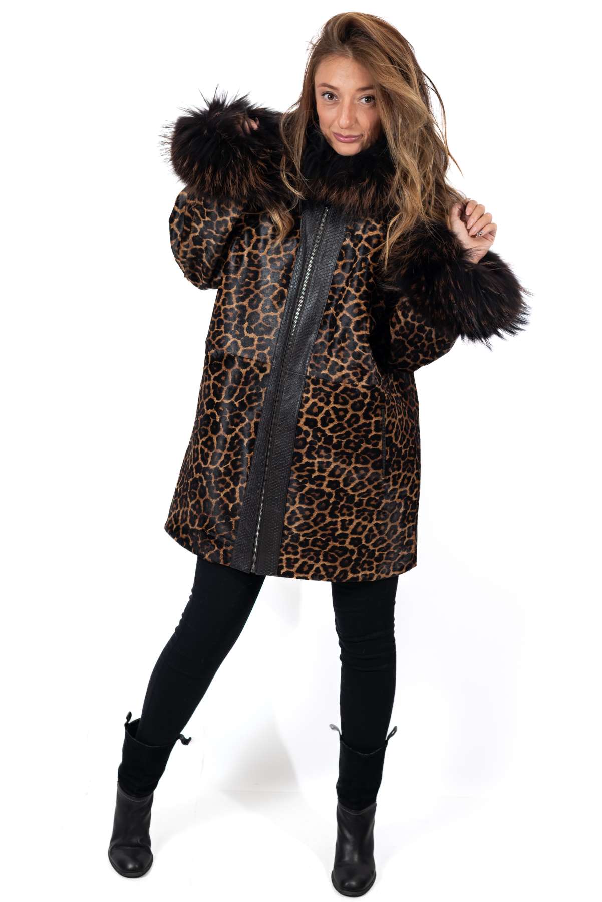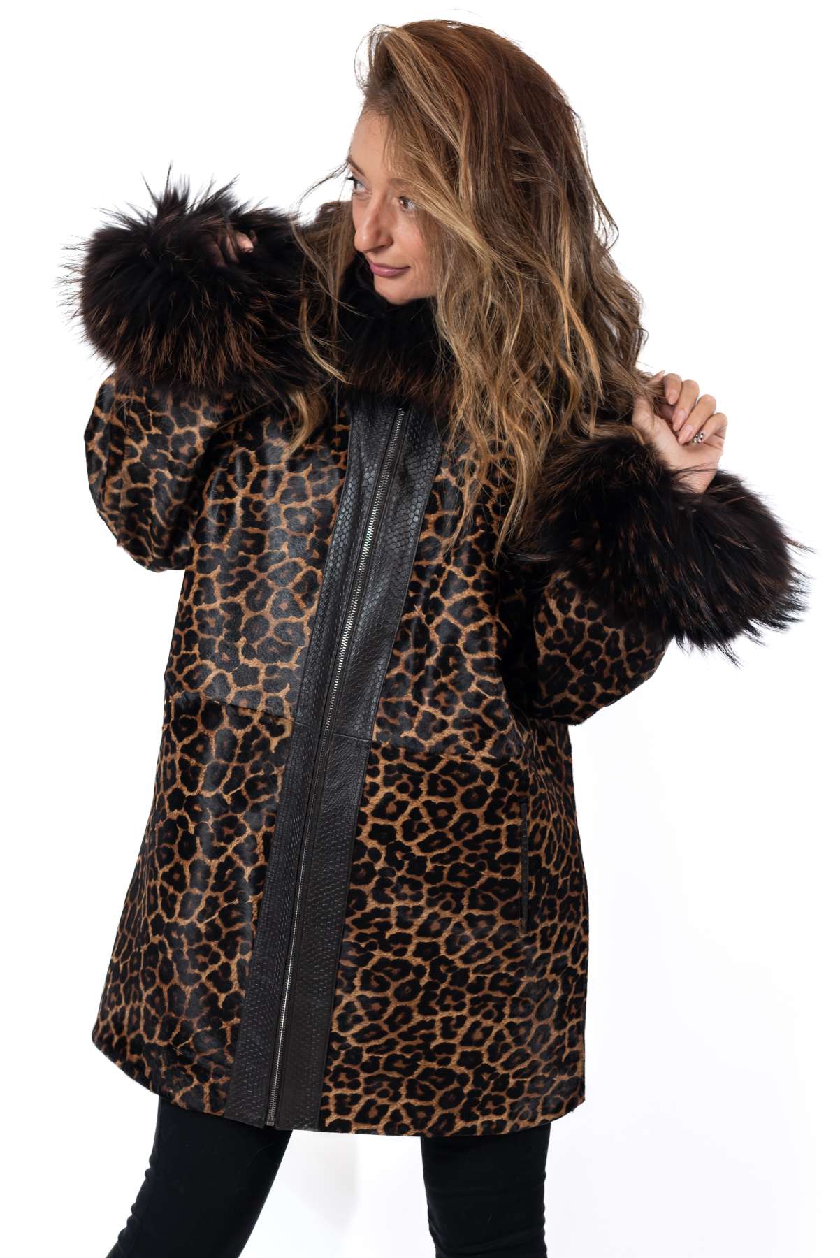 Exclusive women's coat made of Pony fur with a collar and cuffs made of natural Raccoon fur - a symphony of luxury and style. Allow yourself to be the center of attention with this unique women's coat made of high-quality Pony fur, complemented by an elegant collar and cuffs made of natural Raccoon fur.Every detail is created with extreme precision to highlight the unique beauty of genuine leather and create a unique, luxurious silhouette.The rich hues and characteristic pattern of the Leopard print bring a sense of natural harmony and wild elegance, while the Raccoon collar and cuffs add completeness and an aristocratic appearance.This coat is the perfect choice for ladies with sophisticated taste who are looking for not just warmth, but a real jewel in their wardrobe - a symbol of luxury, confidence and unique style. Created for special occasions, but also versatile enough to turn any winter day into a podium of elegance.