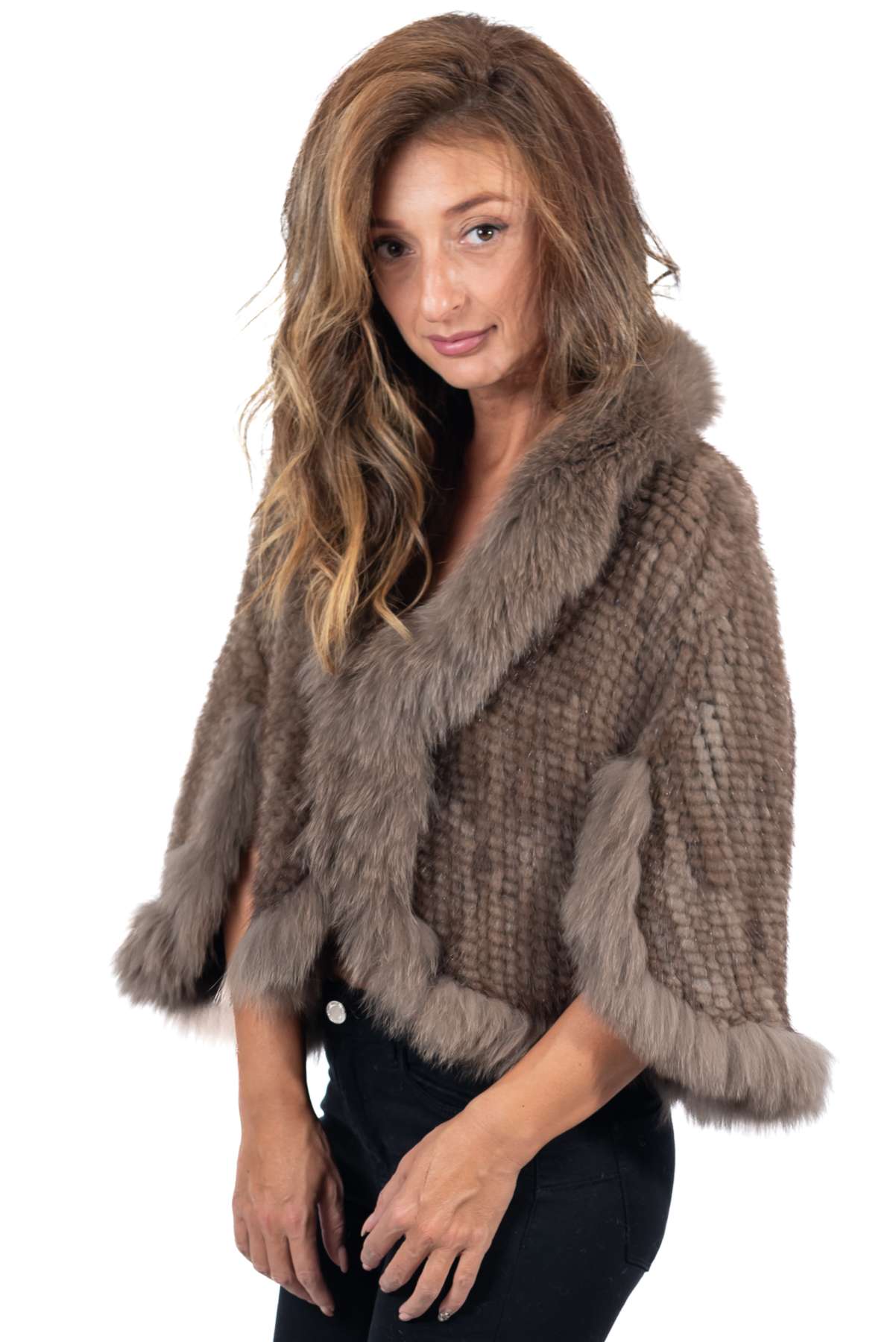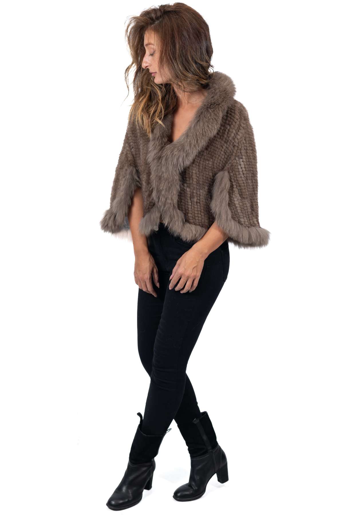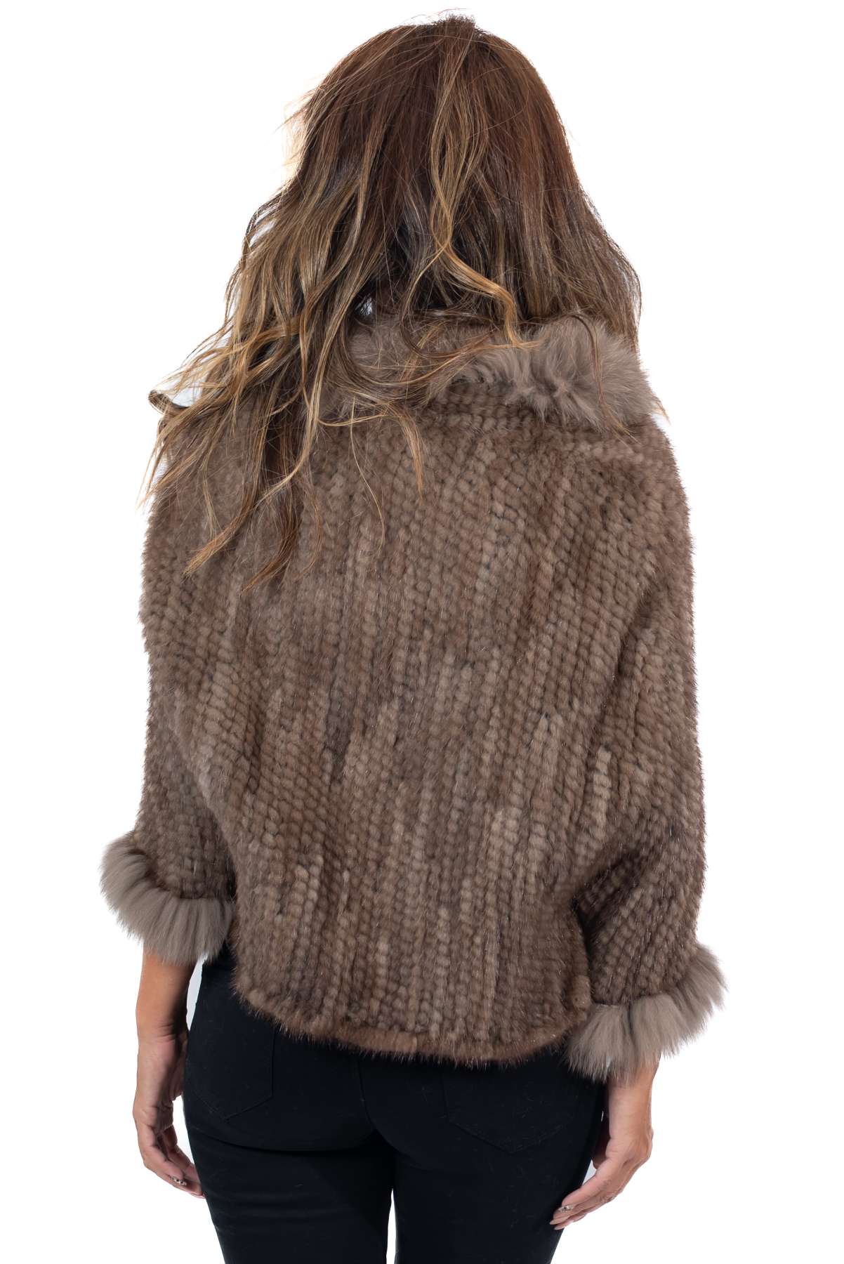 Exclusive women's short coat made of knitted natural mink. Extremely elegant coat, made using a special technology in which the mink is woven in. It is even suitable as a cape over a formal dress. The Divna coat has 3/4 sleeves and is completely trimmed with natural fox fur..The knitted mink coat is suitable for warm winter days. The silhouette is straight and loose. It fastens with a button, clip type.