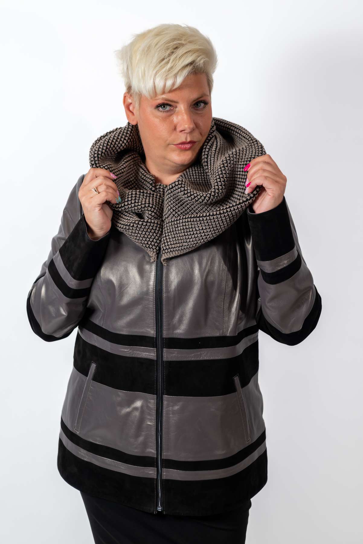 Women's leather jacket Karina exudes elegance and comfort in one. Infuse style into your everyday life with the Karina leather jacket, created for women who value quality and a sophisticated look. Made of soft high-quality natural lambskin, it provides unparalleled comfort and durability.The sporty-elegant design with a unique knitted collar/hood and a sophisticated color combination in gray pearl mink with black accents makes it easy to combine with both casual and more elegant outfits.The length of the Karina leather jacket offers a balance between style and practicality, and the convenient zipper closure and light warm lining guarantee comfort at all times. A suitable outerwear for the spring-autumn season and warm winter.