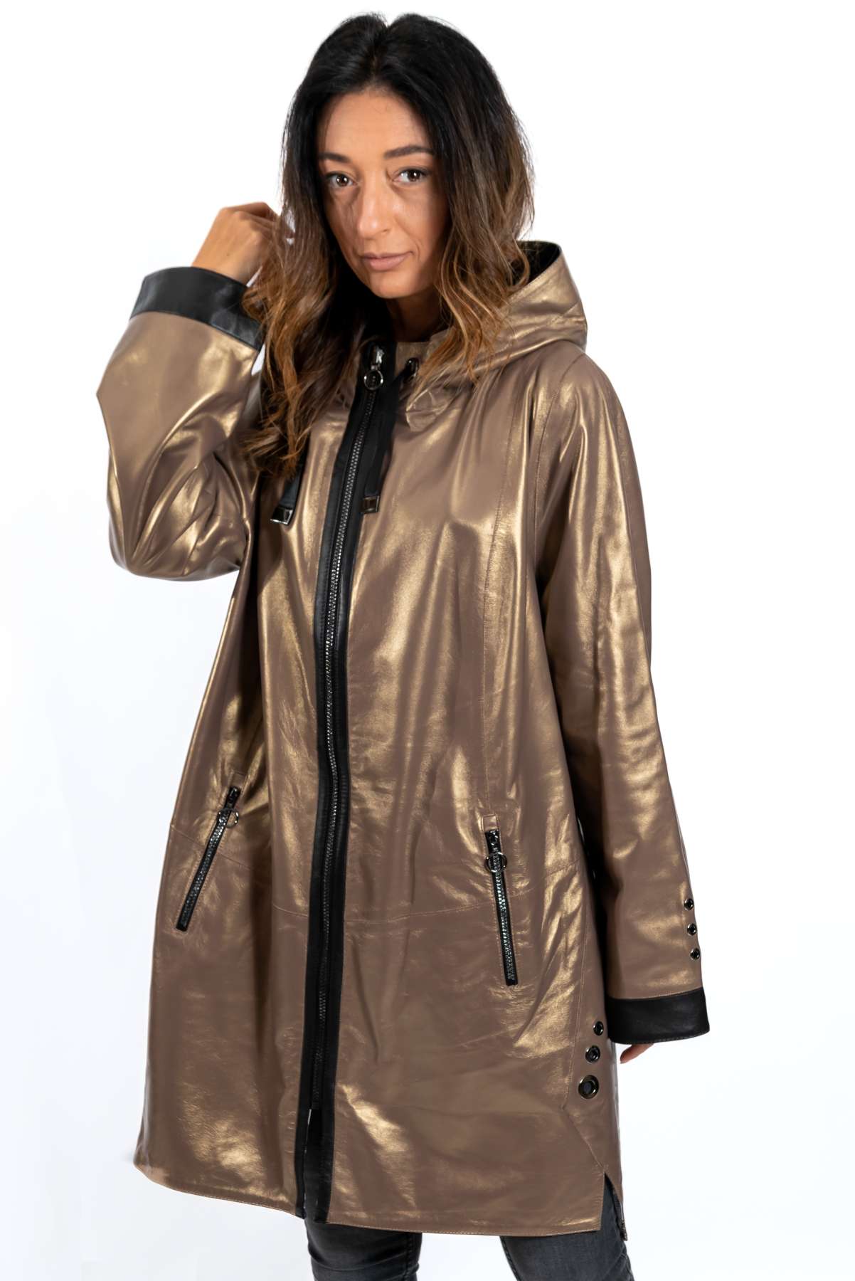Women's double-sided coat Zhiselle is elegant, with an elongated and straight silhouette. The women's leather coat is made of high-quality natural lambskin, extremely soft and durable. Elegant look, with a comfortable hood in a beautiful color.The cuffs and hood are trimmed with black leather. There are two convenient outer pockets and it fastens with a metal zipper. Leather coat Zhiselle is double-faced. The inner part is made of spectacular and beautiful breathable fabric. Extremely light, comfortable and beautiful leather coat, suitable for thin and very large figures. Leather coat Zhiselle is suitable for spring and autumn days.