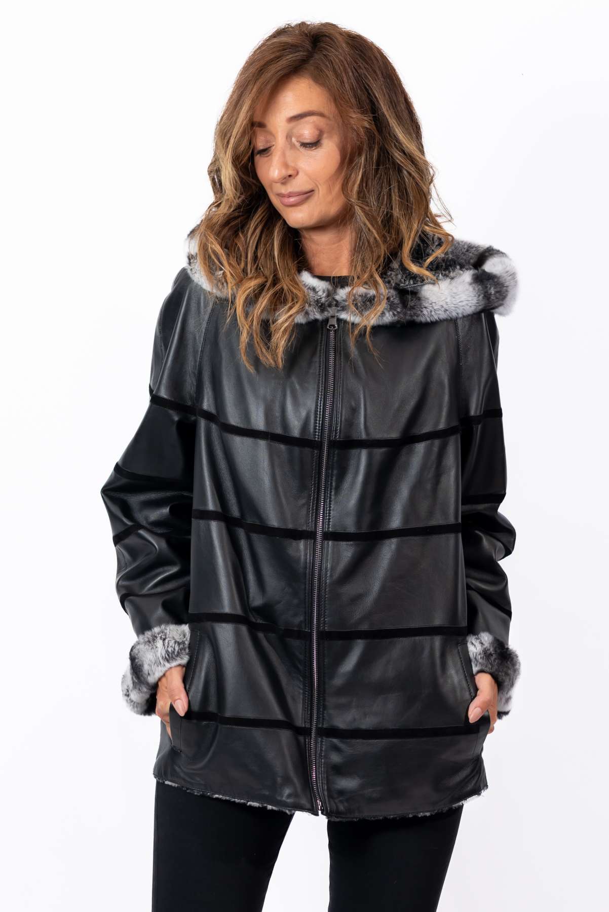 Women's double-sided jacket Lilia is elegant, with an elongated and straight silhouette. The women's leather jacket is made of high-quality natural lambskin, extremely soft and durable. Elegant look, with a comfortable hood in a beautiful black color. The cuffs and hood are trimmed with natural chinchilla.It has two convenient outer pockets and fastens with a metal zipper. Leather jacket Lilia is double-faced. The inner part is made of spectacular warm breathable fabric. Extremely warm, comfortable and beautiful leather jacket,suitable for slim and very large figures. The raglan sleeve provides additional comfort for ladies with fuller arms. The Lilia leather jacket is suitable for warm winter and cool spring and autumn days.