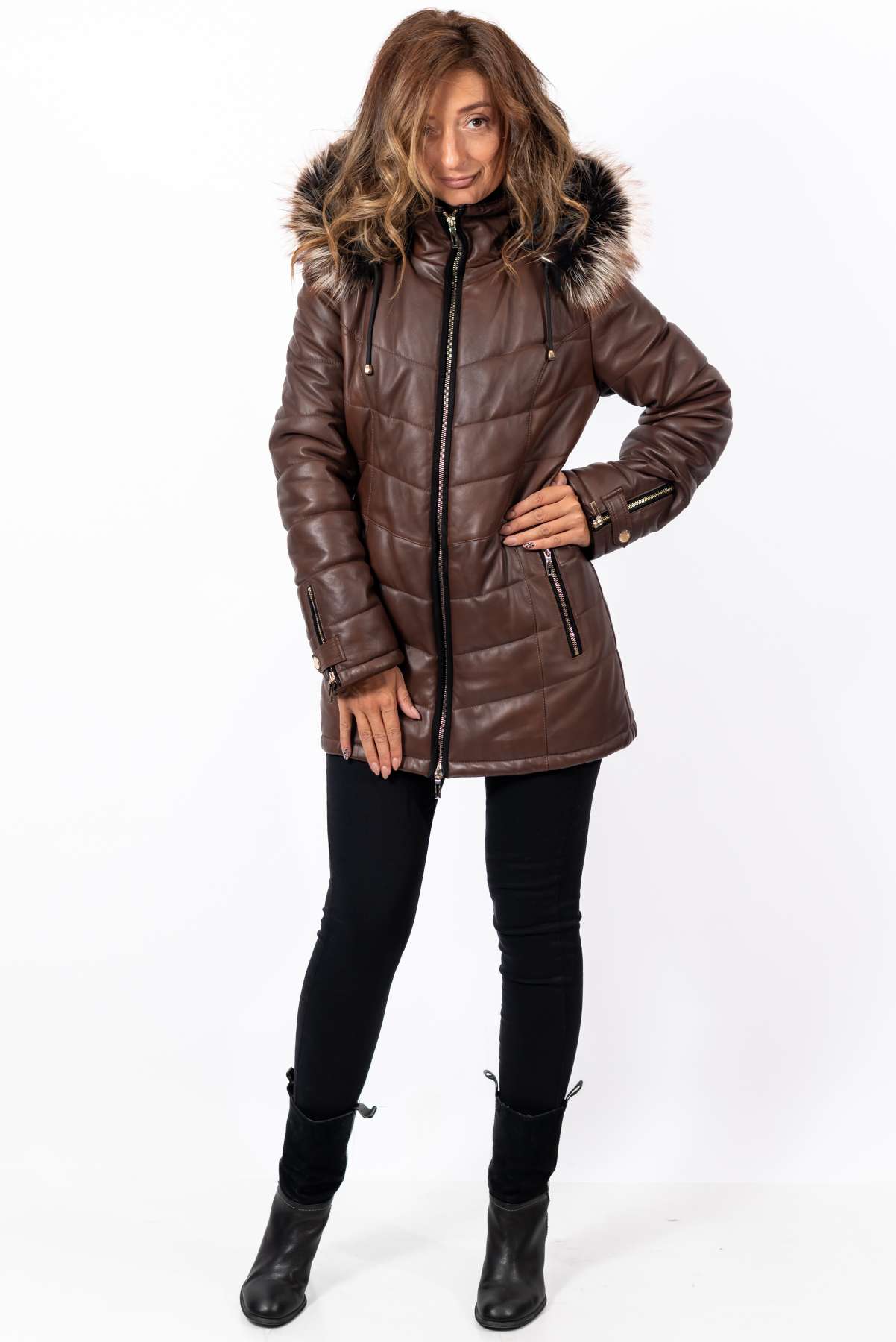 Very warm women's leather jacket with a comfortable length, with a comfortable and rich hood with a Fox. Winter leather jacket Daria fastens with a zipper, has two convenient outer pockets. Interesting decorative seams. Suitable outerwear for the coldest winter days.The leather is specially treated and withstands even -30 degrees.